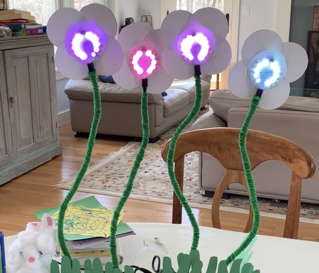 Circuit playground express boards for the flowers. Coat hangers and pipe cleaner for the stems. Set in wood block base with recessed battery for power. Flowers change to random color combinations for a constantly shifting experience.