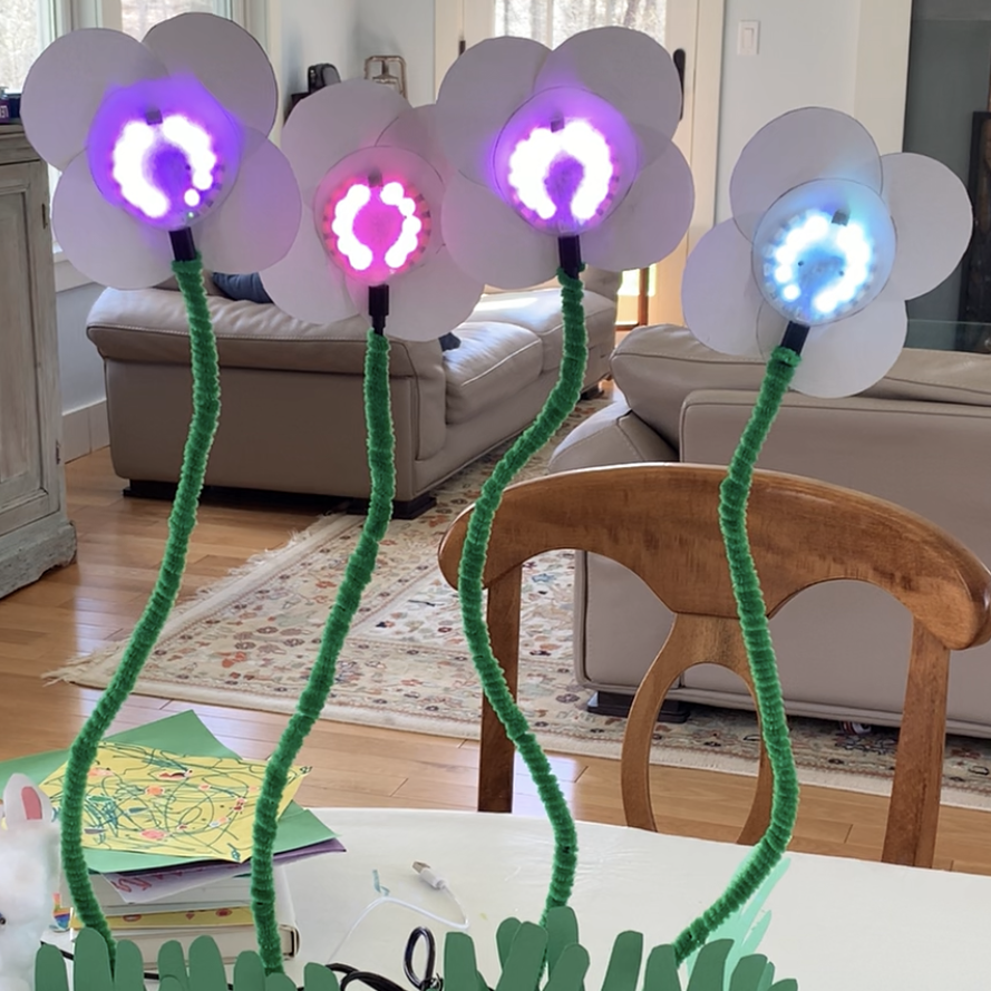 A handmade tech-art project built with my kids as a birthday gift for my wife. Coat-hanger flower stems hide embedded wiring, a routed wooden base conceals the power system, and each flower is powered by an Adafruit Circuit Express running custom Python code to animate soft, shifting LED colors. A mix of hardware, code, and family creativity.
